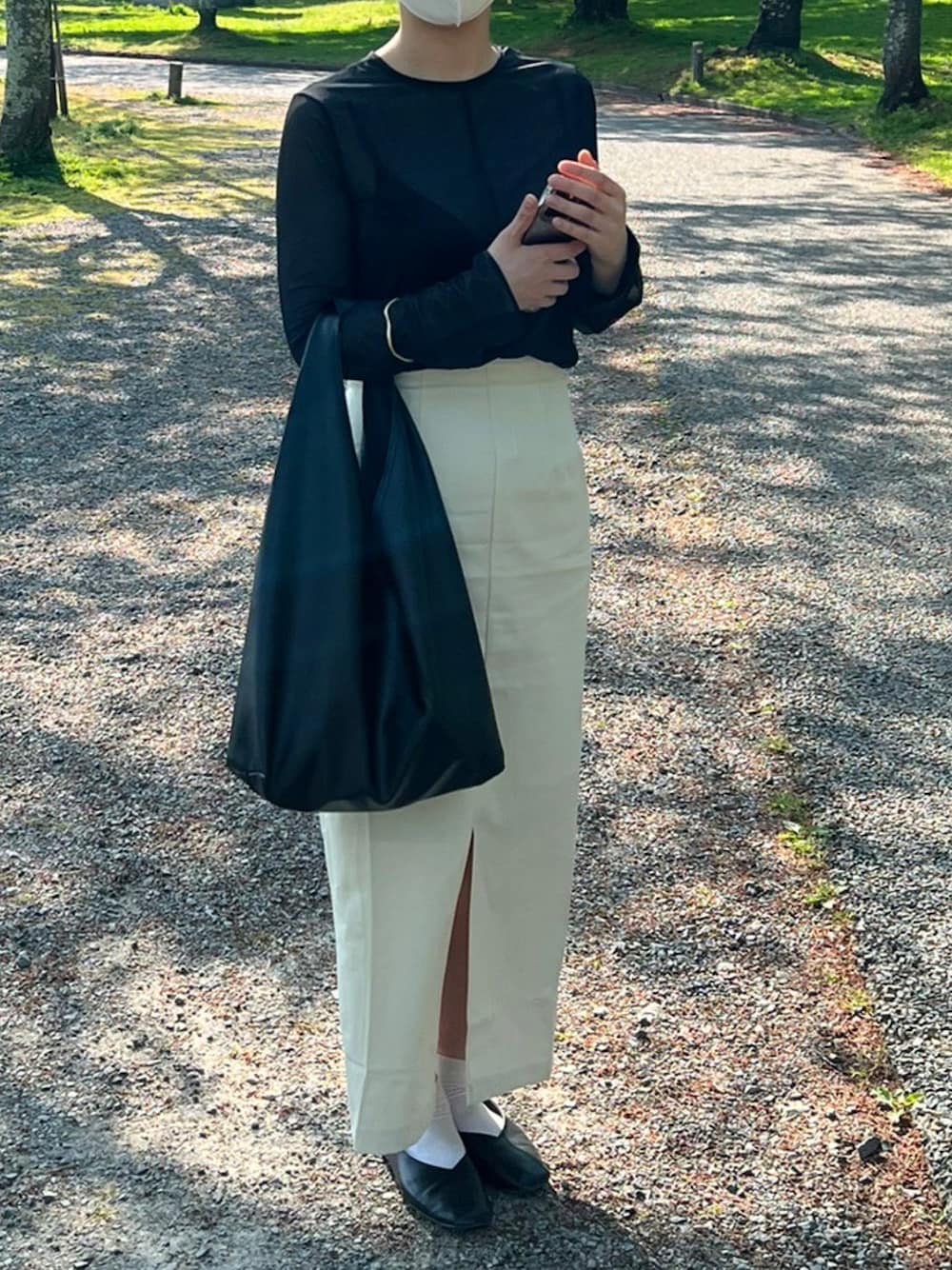 みうのトートバッグ「トライアングル バッグ シルバー A4 無地 トートバッグ」を使ったコーディネート