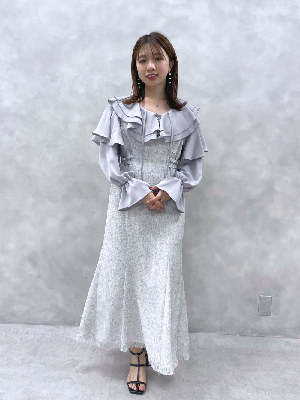 かなみ(natural couture)のジャンパースカート「WEB限定カラー有り/サイドベルトデザインツィードジャンスカ」を使ったコーディネート