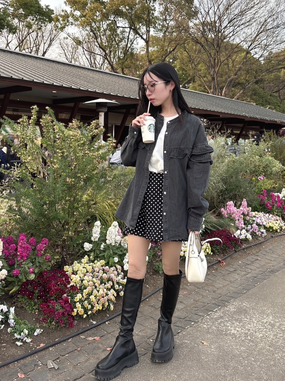 この時期って何を羽織るか迷う😂 デニムシャツ一枚持っておくのおすすめっ 羽織、前閉め、シャツインの着こなし😽 デニム素材だけどフリルデザインだから、 カジュアルすぎず甘さもあって可愛い🌸