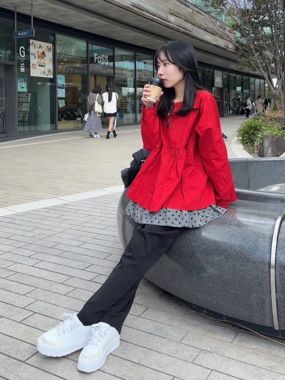 少し前に買ったものだけど、ずっとお気に入りのこのトップス👚 ボリューム感あるフォルムといい、異素材のドット柄といい、印象深い1枚✨ ボトムスはGRLのスラックス! 履き心地がよくて、お出かけにぴったりだよ☺️