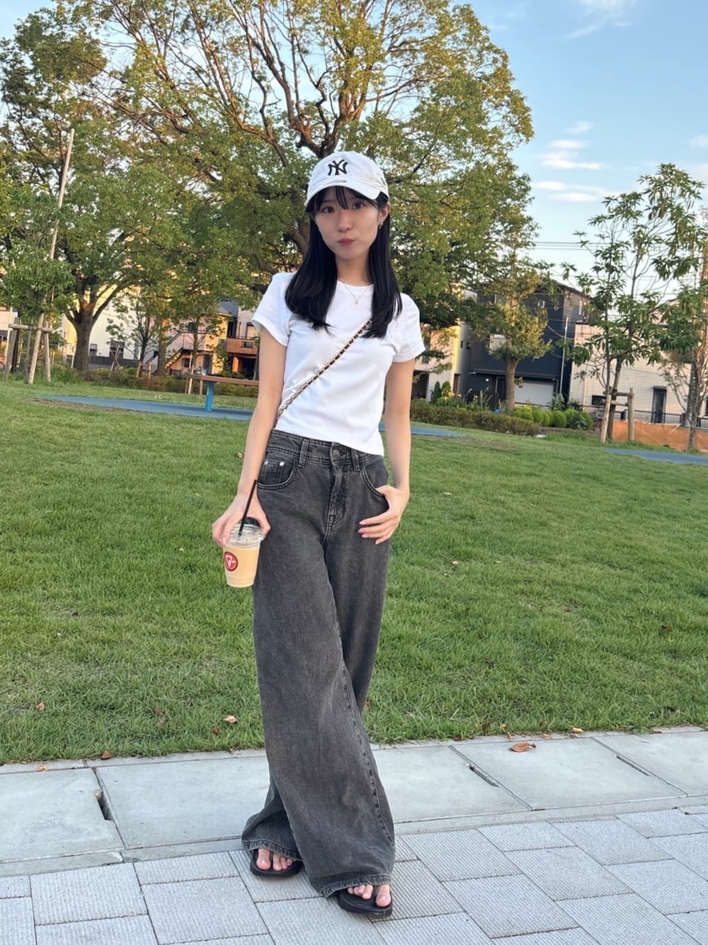 大人気のUNIQLOミニTシャツ‼️ Sサイズだけど、丈がミニすぎないから お腹見えずちょうどいい🙆♀️ ブラックデニム合わせで公園コーデ🐶