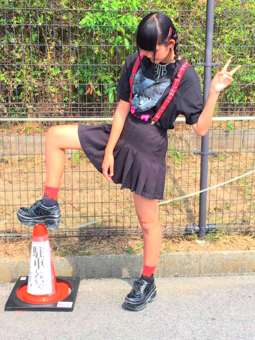 今回はblack×redコーデにしてみました。新しく買ったサスペンダーが可愛くて早速付けてみたらもー思い通りに!!!!!Tシャツの猫も可愛いからすごく好きです♥