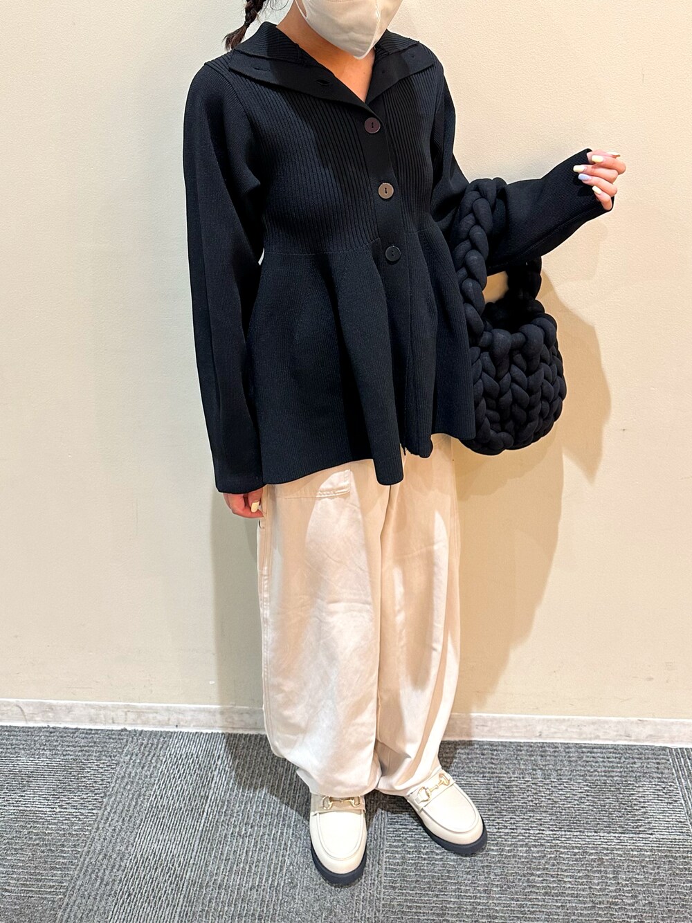 カジュアルモノトーンコーデ🦓☆ パンツは裾にボタンがあるのでとめると丸くゆったりとしたシルエットに👍🏼 小柄な方でも履いて頂きやすいです!!