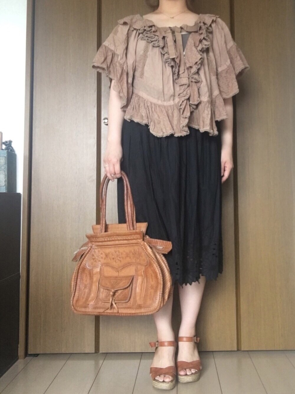 ちょっと秋っぽい色合い… furfurのこのブラウスはいろいろな着方ができる万能アイテムです❤️ まずは普通に着たバージョン❣️