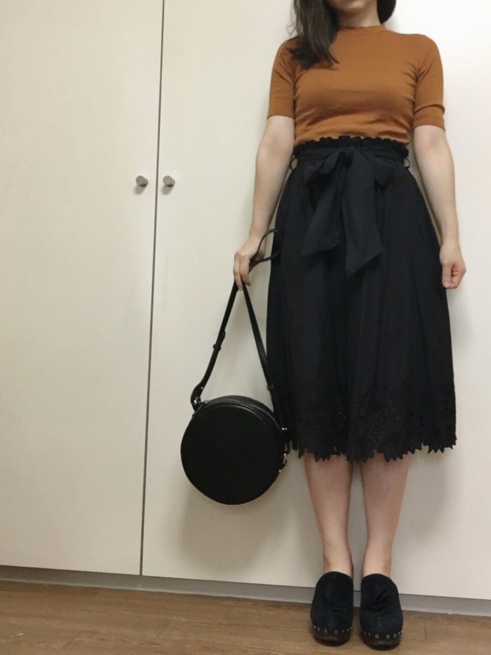 この間のトップスを着まわし〜! テラコッタ×ブラック😘 今日会社で隣の席の子もまったく同じ配色で、 さらに電車の中や街中にもかなり多い💦💦 ちょっと恥ずかしかった😖笑