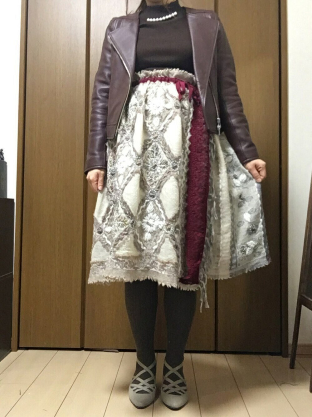このスカート一目惚れして買っちゃいました❤️ ウール混でとても暖かい〜☺️ 見る角度によってジャガード織りの生地やビーズや刺繍が違うところがお気に入り❣️ そしてウエストゴムで楽チン🎵 他の色も欲しい… 妊娠6ヶ月になりかなりお腹が目立ってきた🙄