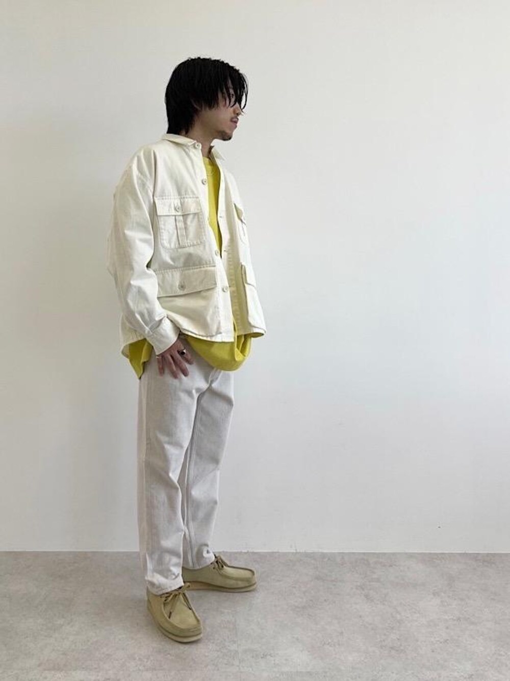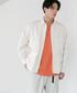 [身長] 170cm [素材感] ジャケット:ユーティリティーに使用出来るコットンツイル素材。 カットソー:エジプトで採取される高級綿、”GIZAコットン”素材。 ボトムス:2色の糸を特殊な織り方で作るコットン混素材。 [サイズ感] ジャケット:ややゆったり カットソー:ゆったり ボトムス:ややゆったり [コーディネートポイント] トレンドのホワイトアウターにビタミンカラーをさしたフレッシュなCITYカジュアルスタイリングです。ボトムもオフホワイトを合わせてクリーンな印象に仕上げました。