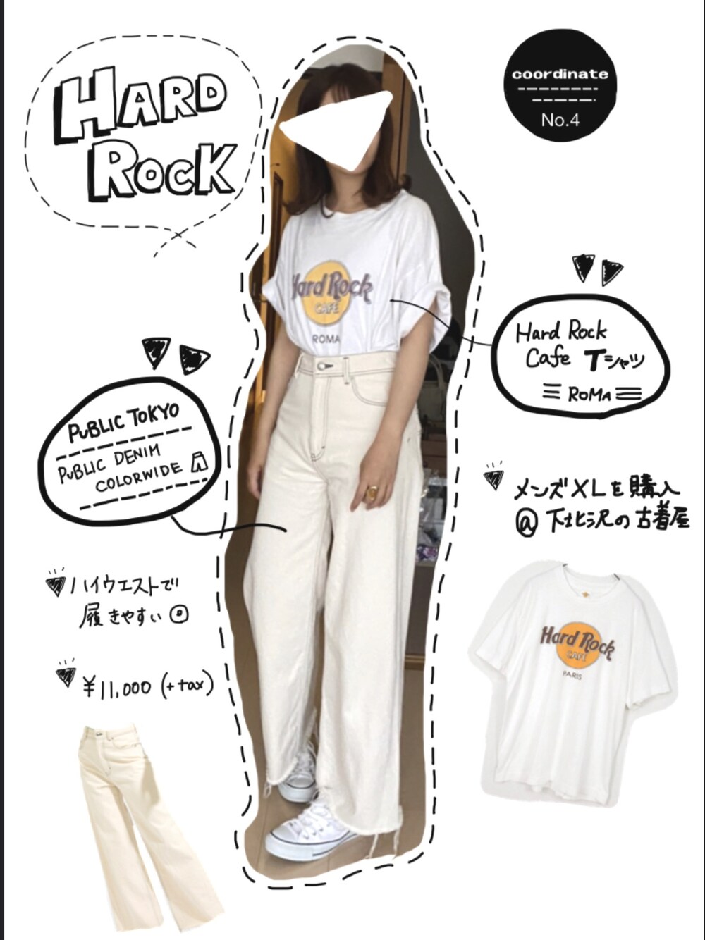 シルエットとオフホワイトの色に一目惚れして購入したハードロックカフェTシャツ✳︎ ちょっと袖を折ってラフに