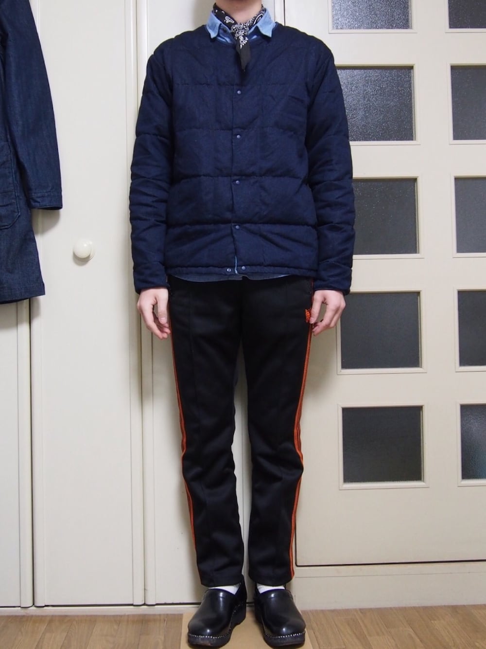 Needlesのトラックパンツをメインに他はシンプルに。 首に巻いたバンダナがアクセント。 防寒にはなりません。