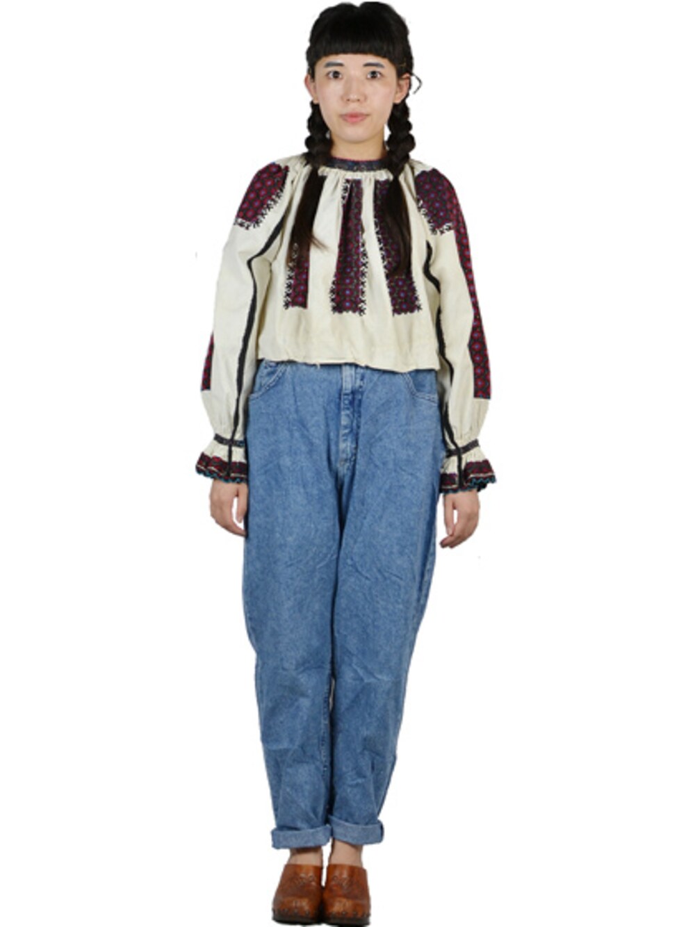 VINTAGEの刺繍ブラウスをデニム、サボと合わせてシンプルに◎