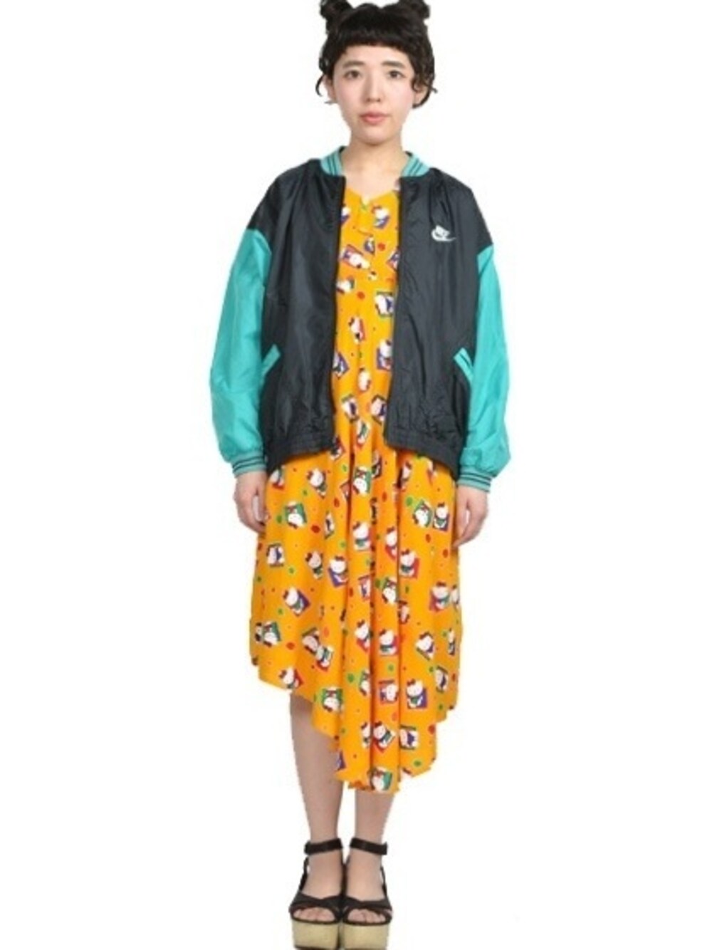 NIKEナイロンジャケット×KITTYワンピース×厚底サンダル