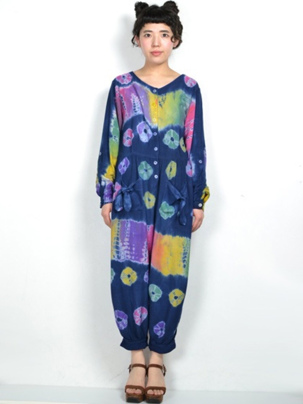 タイダイ染めオールインワン×ウッドソールのデザインサンダル