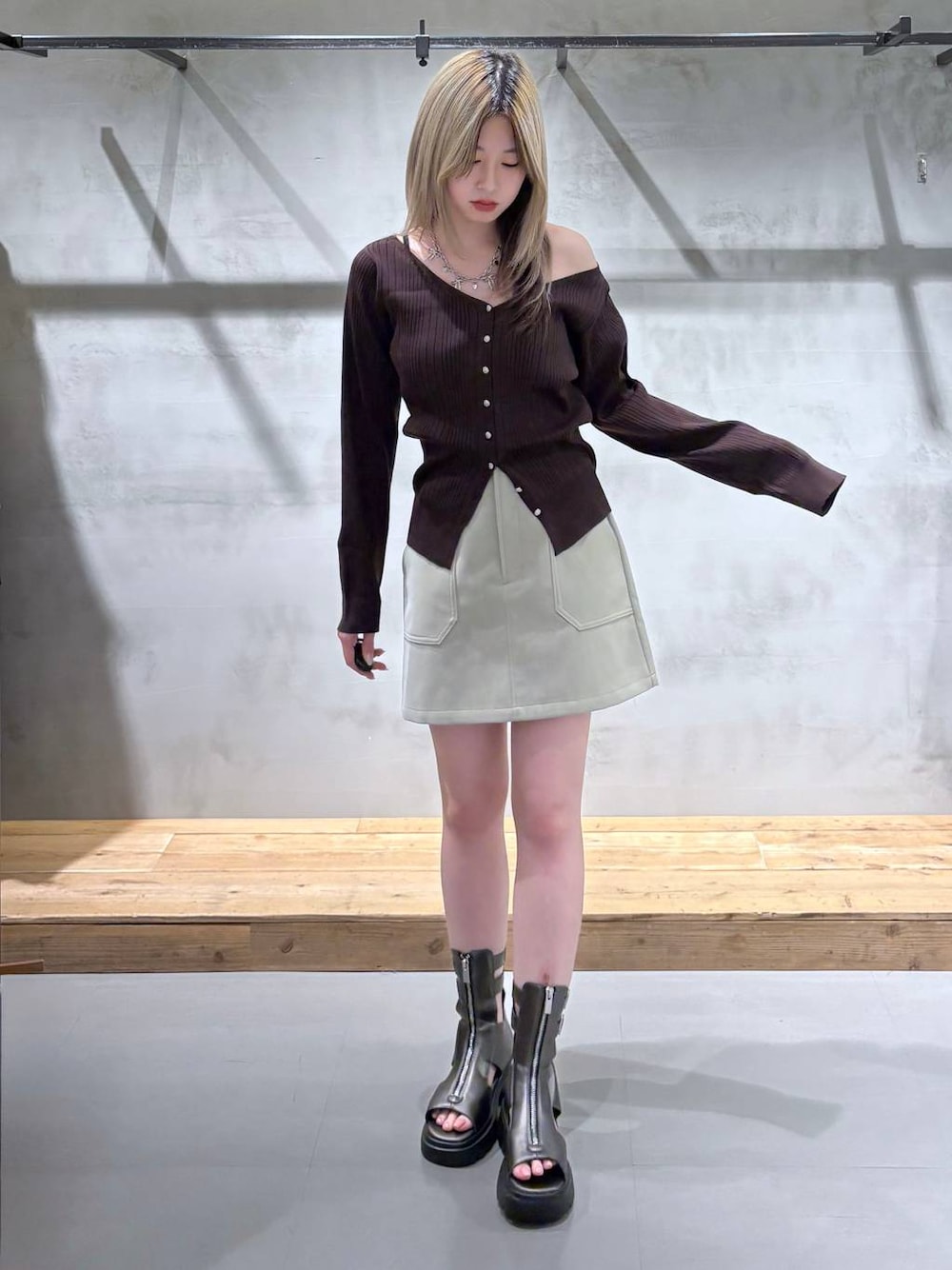 【韓国風きれいめシンプル】 ◉カーディガン 広めの襟ぐりで女っぽ見えするので、スウェットパンツに合わせるとバランスよくラフ感を抑えられます🙆 生地は少し分厚めで、秋までしっかり長く使えそうです☺︎ 全骨格キレイに着られるトップスかも🪄 ◉ミニスカート レザーとスエードが合わさったような風合いの素材です♩ 着ていて型崩れしにくいので、綺麗な台形のラインで着られます🙆 このライトグレーは、アイボリーのような、ちょっっとだけカーキっぽいくすみ感のある絶妙カラーなので、気になる方は是非店頭で見てみてください👀 (私の目には、割とこの写真通りの色に見えてます!)