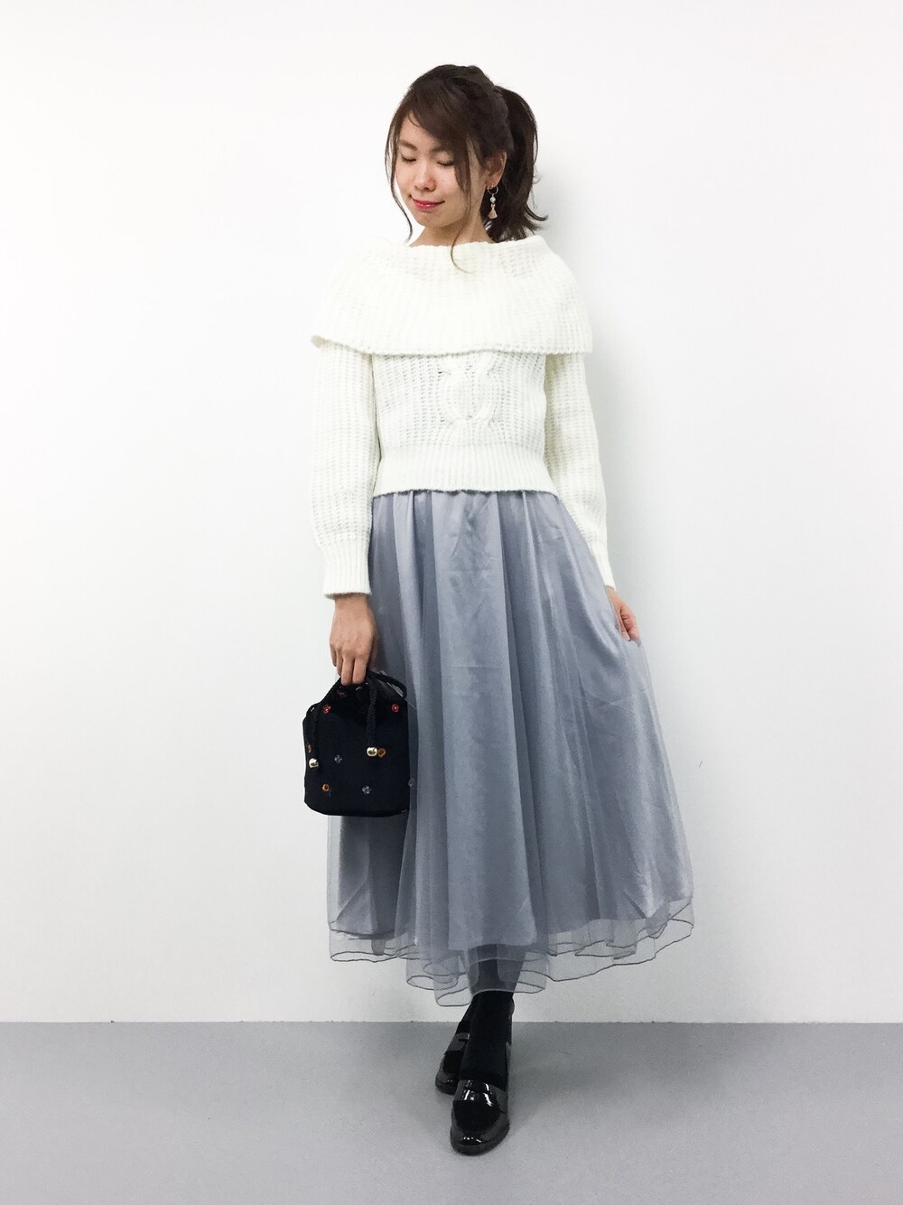 miyaseのニット/セーター「オフショルレースアップニットプルオーバー」を使ったコーディネート