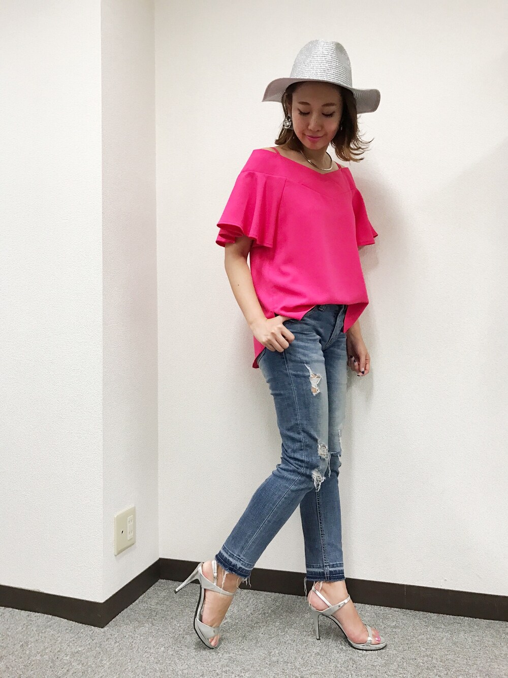 *** ザ・M.deuxカラーのピンクトップス‼︎ ネックの空き具合、袖のラッフル感のバランスが◎ デニムとシルバー小物でカジュアルに‼︎