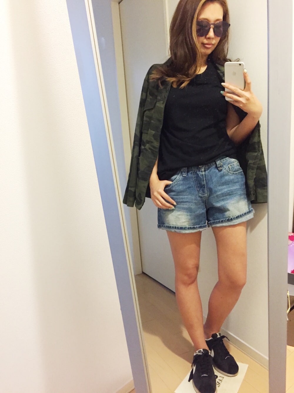 2015.06.28*** マツエク行ったから、サングラスコーデ☺︎ 仕事ではスニーカーNGなので、久々に履いてみました♡ UNIQLOのパックT、クルーネックはSサイズをGET‼︎ Tシャツはやっぱり前だけINですね(^^) そして夕方肌寒いので、迷彩ジャケットを肩掛け。