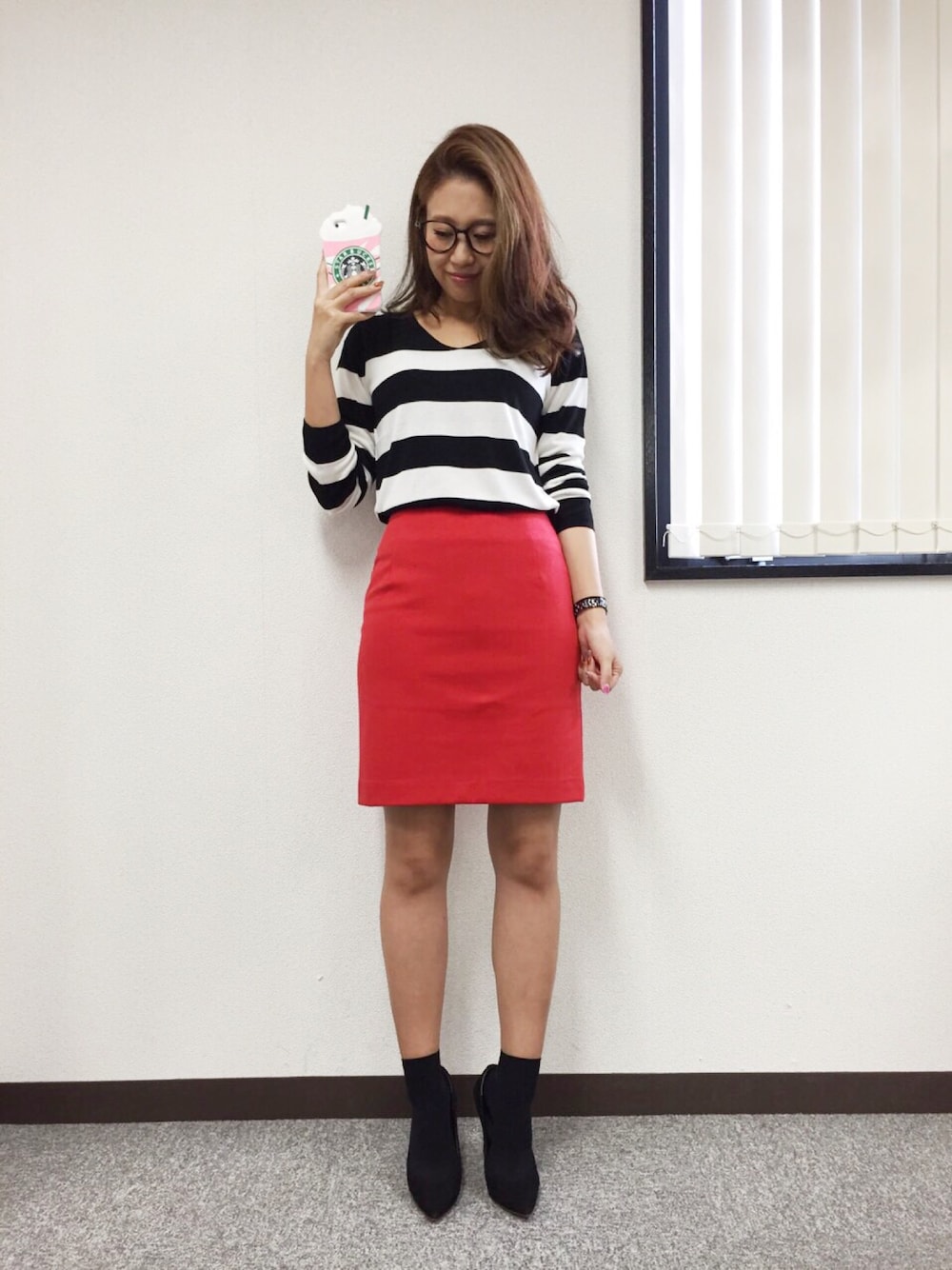 2015.09.04*** なんか久々にボーダー着ました☺︎ ボーダー×赤♡ 好きな組み合わせです‼︎ 赤のタイトスカートは、エレガンスになりすぎないよう、カジュアルダウンするのがやっぱり好き♡