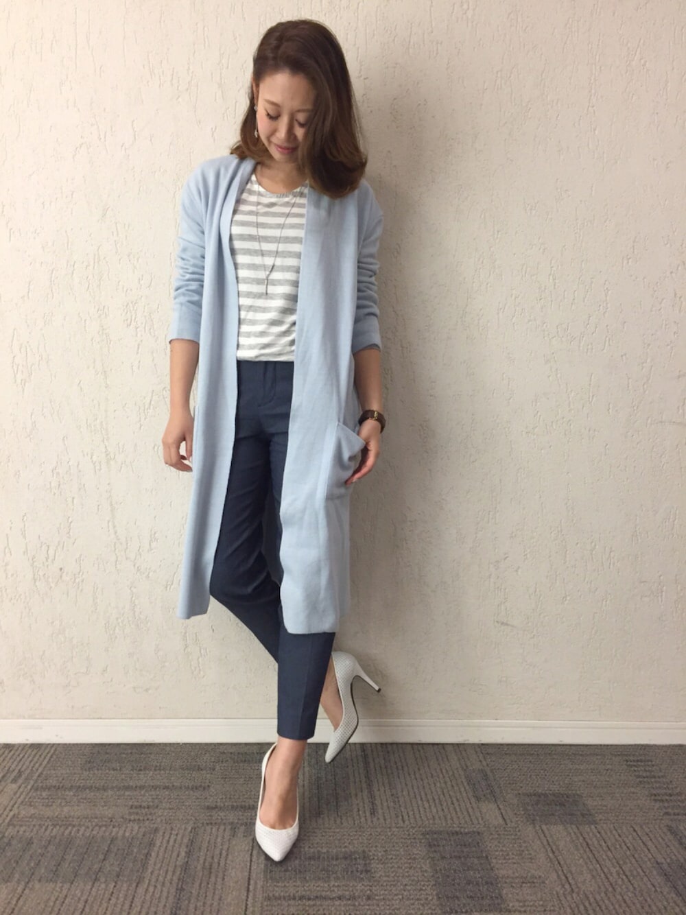 2016.04.12*** "デニムハイパーストレッチ"という生地を使用したパンツ‼︎ その名の通りめちゃめちゃ穿きやすいんです(°0°)‼ センタープレス入りのパンツなので、きれいめコーデにもバッチリ(^^) サックスのロングカーデと合わせて、ブルーのグラデーションコーデにしました! Instagram⇨MIYA_1028 コーデ用⇨M.deux_miya