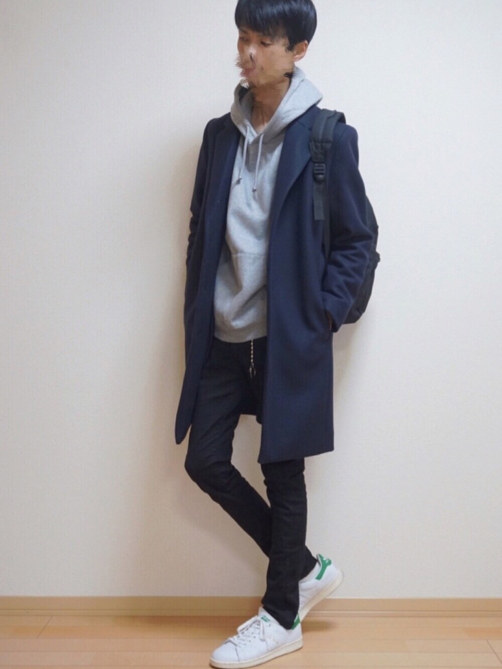 チェスターコートをカジュアルに! ネイビーとグレーの組み合わせはきれいめな印象になりますね! カジュアルダウンしてきれいめカジュアルコーデ!
