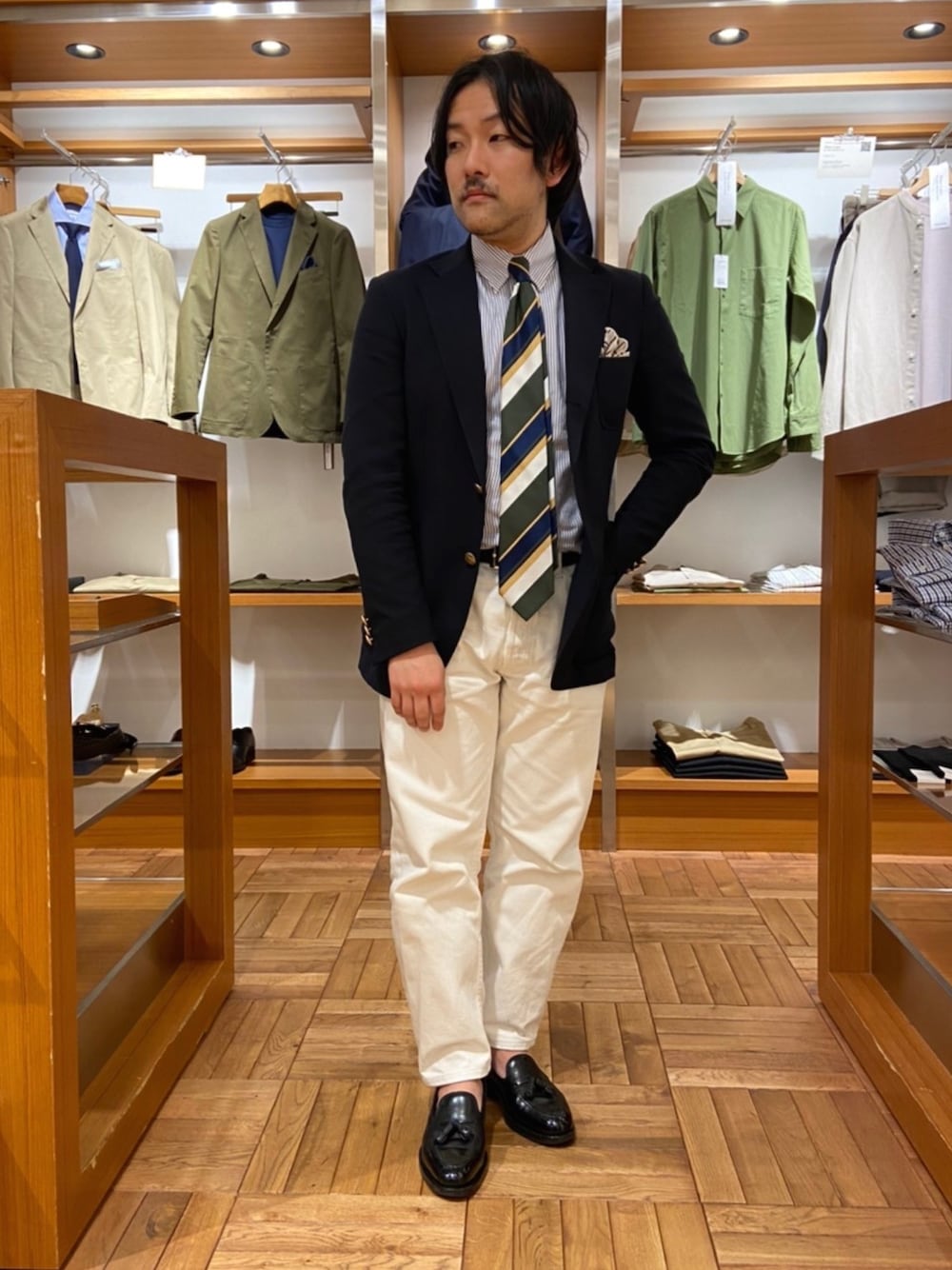 地味にお気に入りのスタイリングです。 紺ブレにホワイトデニムの鉄板アイビースタイルです。 シャツはボタンダウンではなく、あえてタブカラーでフレンチアイビーのエッセンスもミックスです。