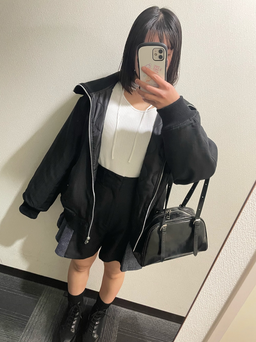 やっぱりショート丈ズボンにはショートのアウターですよね めっかわ♡ 靴はいつもの厚底にしたけど、革の厚底でもキマってかっこいいかもと私は思いました!