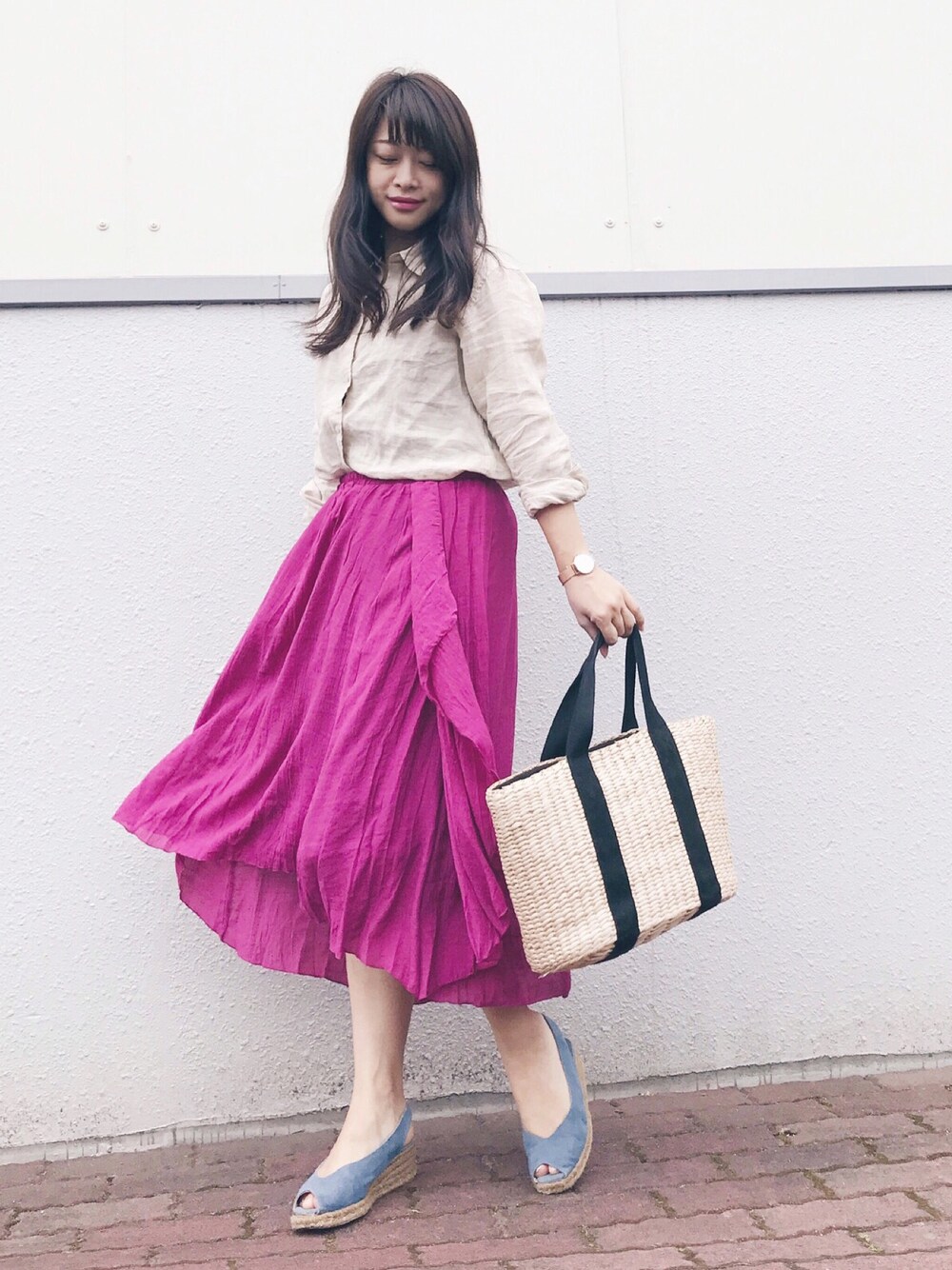 miyacoのスカート「[柔かな薄手生地が軽やかに揺れる]フロントフリルウエストゴムスカートボトムス/スカート/膝丈・ミモレ丈(51~65cm)[リエディ]」を使ったコーディネート