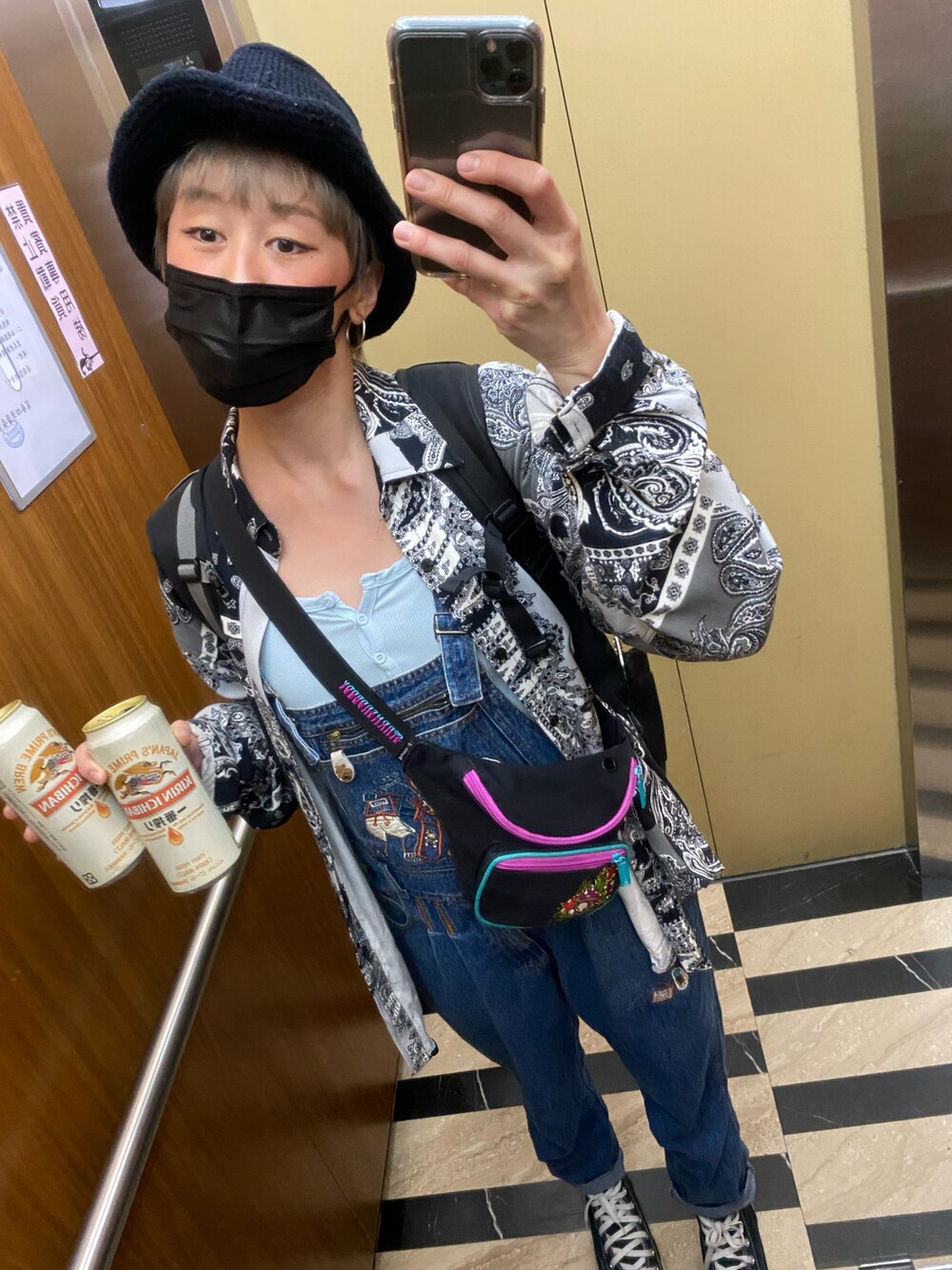 沒有全身鏡的時候, 電梯鏡就是你的自拍鏡😉 吊帶褲愛好者 酒精愛好者🍺