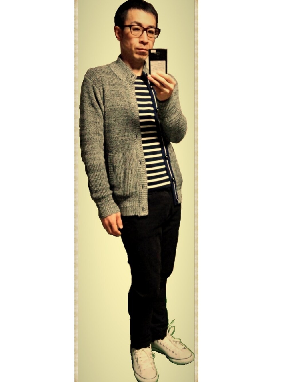 着回しコーデ。 メガネ:TOMMY HILFIGER ニットカーデ:Men's BIGI