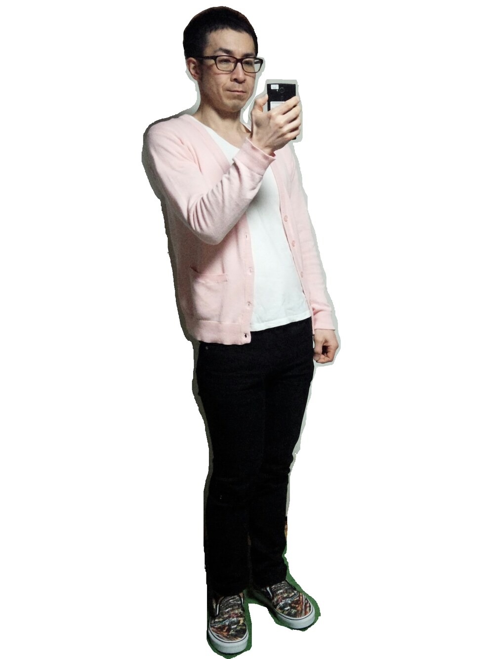 カーデで春コーデ着回し。 メガネ:TOMMY HILFIGER カーデ:NO BLAND Tシャツ:NO BLAND スキニー:GU スリッポン:VANS