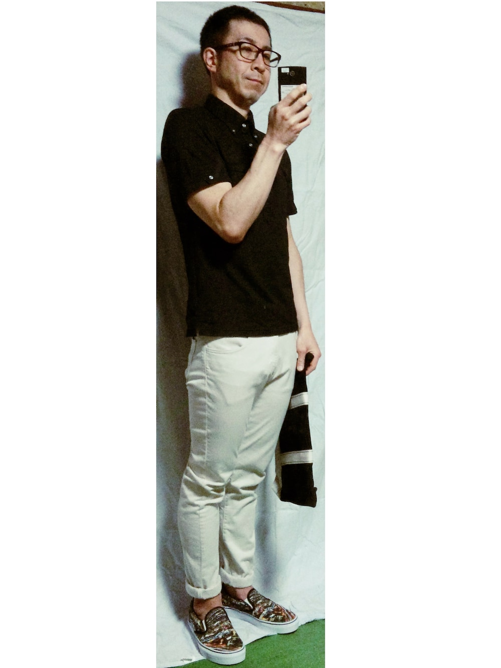 ポロシャツコーデ。 カラーをクラッチバッグと合わせ、 シンプルなスタイルを靴で外してみました。 メガネ:TOMMY HILFIGER ドット柄ポロ:Men's BIGI