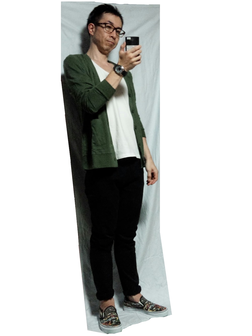カーキ×ホワイトコーデその1。 メガネ:TOMMY HILFIGER カーデ:NO BLAND UネックT:NO BLAND テーパードパンツ:UNIQLO スリッポン:VANS 腕時計:NO BLAND
