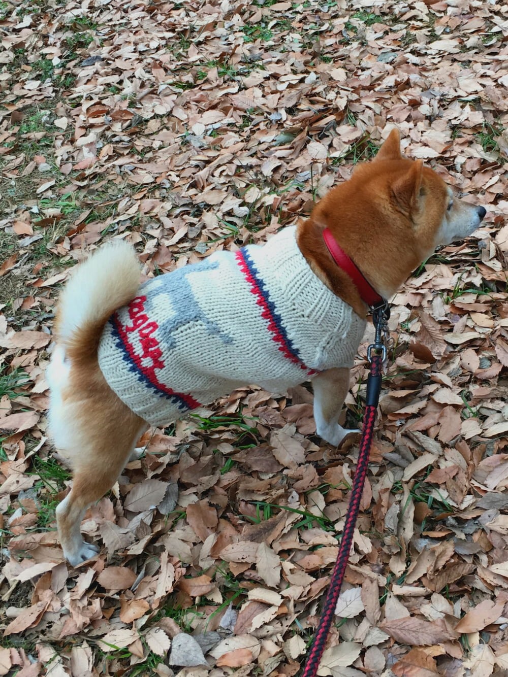 寒いのでカウチンを着てお散歩🐕 落ち葉と柴犬はよく似合う🍁