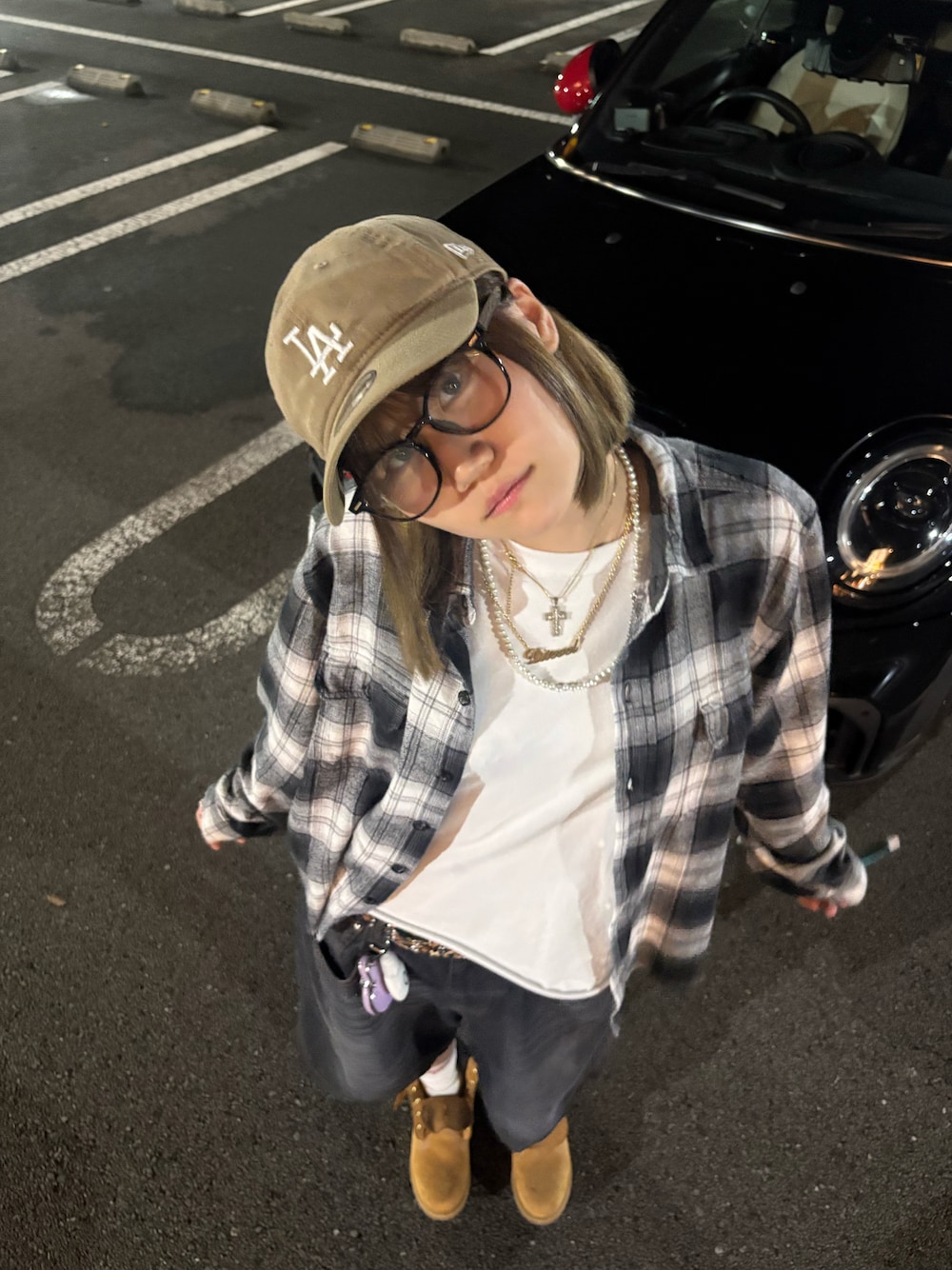 帽子とベルトと靴で色を拾ってます。 チェックシャツが可愛い😸