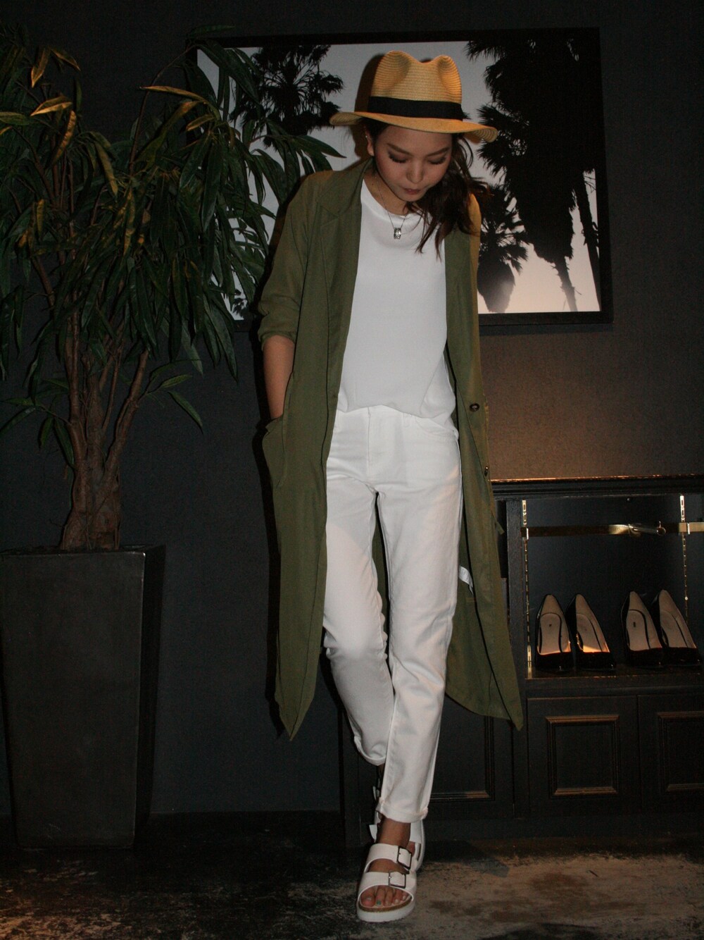 トレンドのカーキに中はオールホワイトでまとめました! ホワイトと合わせることで重たくなりすぎず爽やかに着こなせます♪ スポサンは歩きやすさ◎で愛用しています〜!!