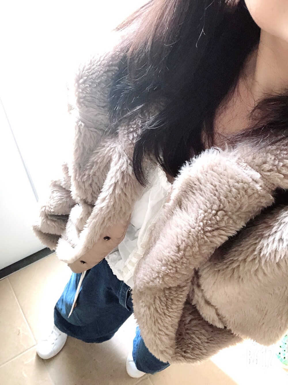 今日も暖かい でも、モコモコが着たくて 中は夏仕様です が、デニムの下に七分丈の レギンス履いています💦