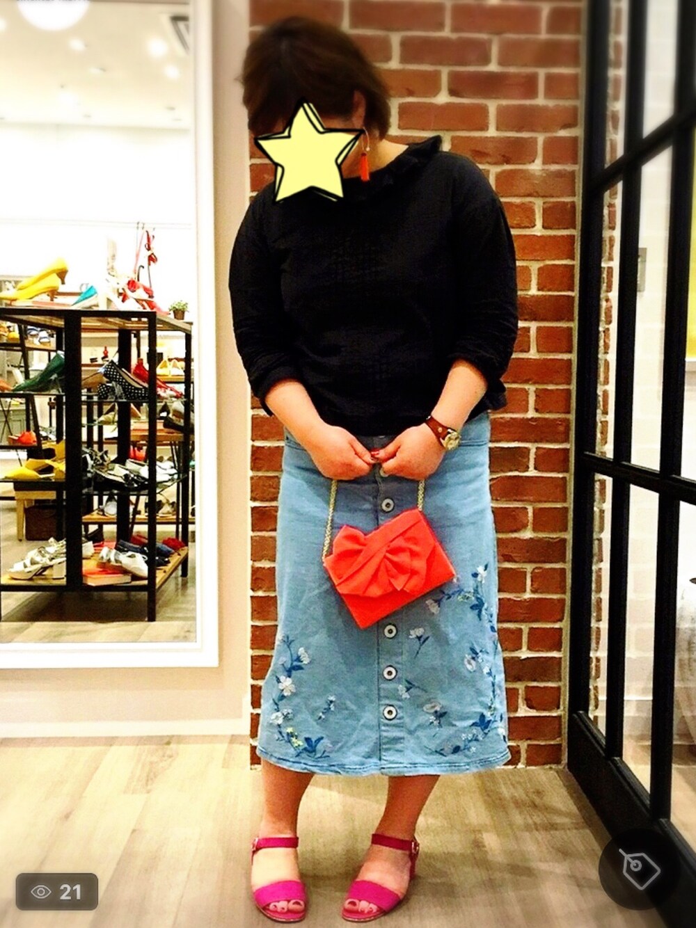 刺繍デニムスカートにピンクのサンダルを合わせて見ました😎