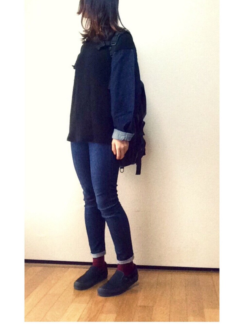 今日も天気が悪い… ニット着たいから暑いのは嫌だけど、天気は良いほうがありがたい。 トップスは袖だけデニム生地なんです。 差し色でボルドーの靴下。
