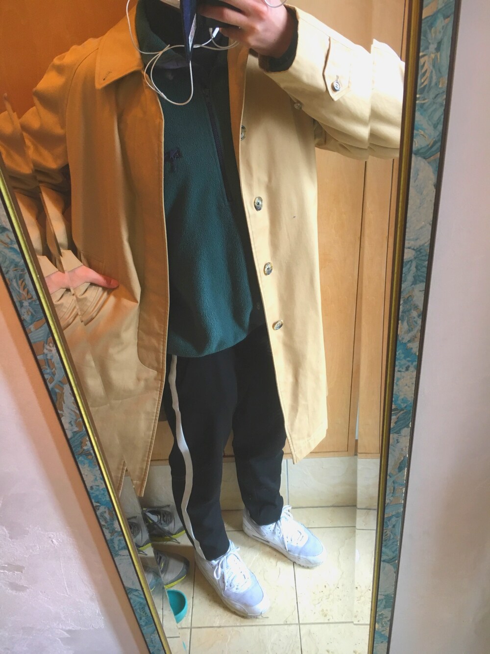 ベージュのトレンチコート(薄目)を中心にパンツを黒にして、メリハリをつけて、フリースを濃い緑をもってくることで、いっけんベージュと合わないのでは?という感じが出るが意外と合います!!笑 そのために革靴にしたかったが、スニーカーで白をもってきて、黒と白で下半身は締まっているようにしました✨