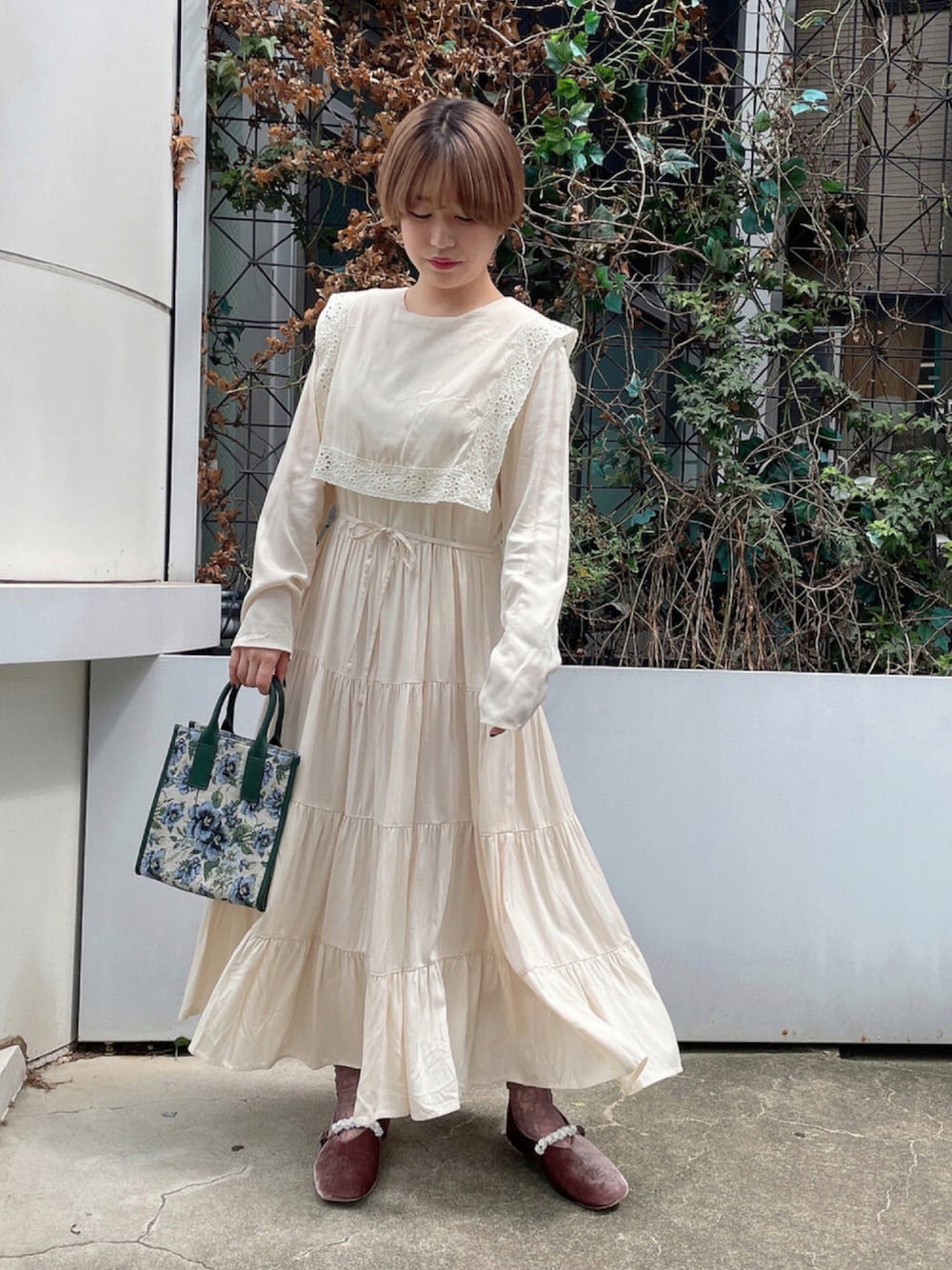 レーヨン素材でテロンとした柔らかい素材感で ふわんと揺れるティアードが女性らしい1枚…♡ ジャガードのハンドバッグを合わせて秋らしさを プラス🍂 〜Instagram〜 @merryjenny_staff_misaki