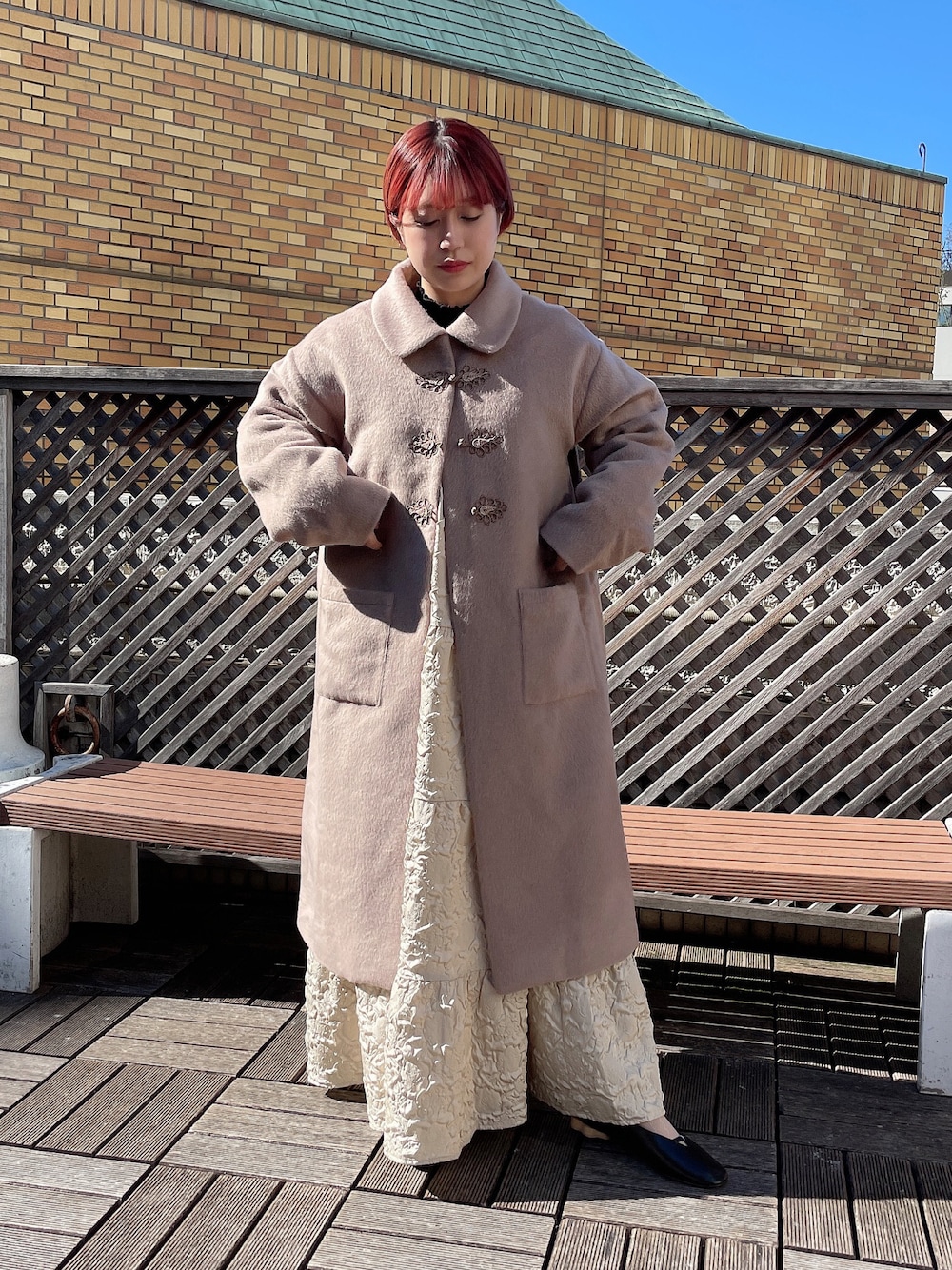 シンプルな無地のステンカラーコート。 チャイナボタンをあしらっているので、こなれ感のある ワンランク上のおしゃれコーディネートになります🐼 インナーは立体的な花柄が珍しいキャミワンピースをコーデの ポイントにモノトーンでまとめた大人のお出かけコーデ✨ 〜Instagram〜 @merryjenny_staff_misaki