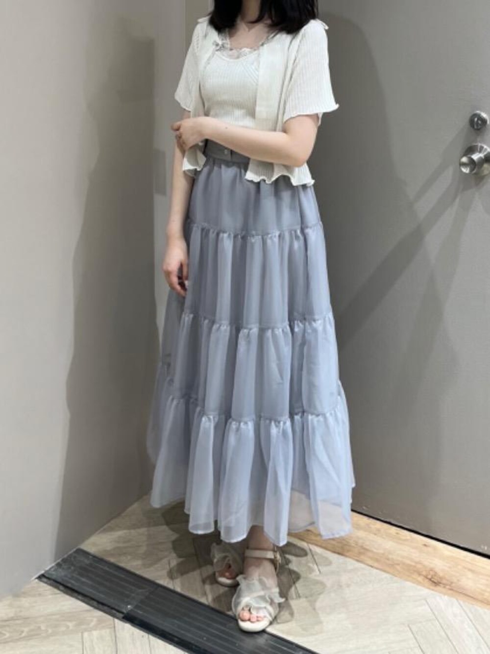 ビーズリボンが可愛いカーデセットキャミとシアースカートを合わせました🎀 トップスがぴったりとした素材感なのでボトムでボリュームのあるものを合わせました🫶🏻 カーデはキャミセットなので別々でも使えちゃいます💞