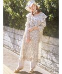 ふわりと、風に乗る 軽やかさ。 たっぷり ギャザーを寄せたフリルカラーは、 深めのV開きと リボンですっきりと。 カットソーをレイヤードしたり、 暑い時期には キャミソールを合わせフェミニンにも。 ジャガードチェックにモノトーンの花柄をのせ、 愛らしくフェミニンな印象のお揃い柄のhatを組み合わせるのも おすすめです。