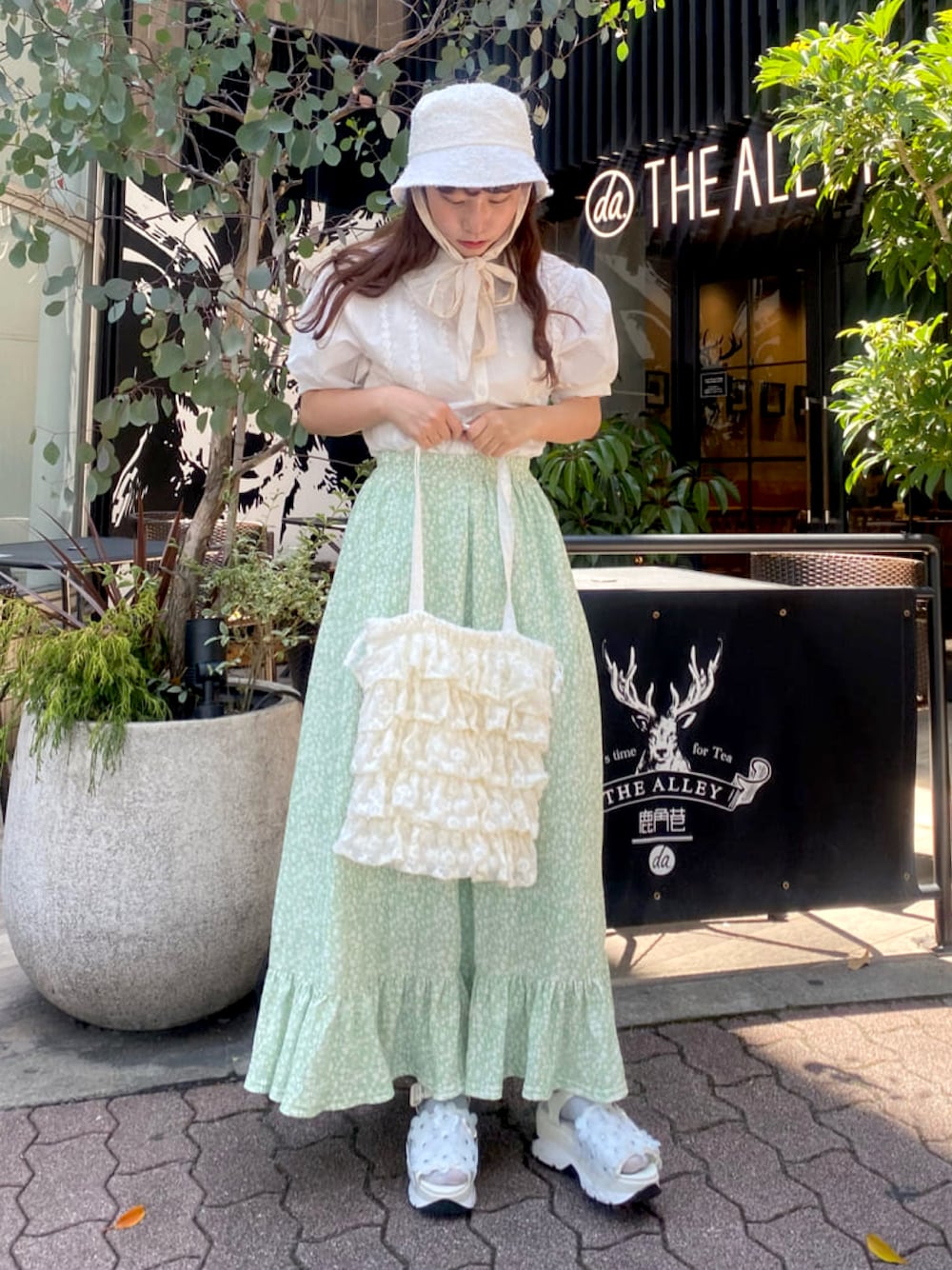 ふんわり広がるお花柄のスカート。 ウエストはゴムなので、ノンストレスな履き心地です。 身長154cmで引きずらない丈感なので、 低身長さんにもおすすめ♡ ブラウスはお花のテープがポイントです! 薄手のコットン素材で、 暑い時期にぴったりのアイテムです。 シャギー素材のバケットハットは リボン紐が取り外し可能なので、 キュッと顎下で結んでガーリーにも たらんと垂らして大人っぽくも被っていただけますよ♡ Instagram @merryjenny_staff_koto