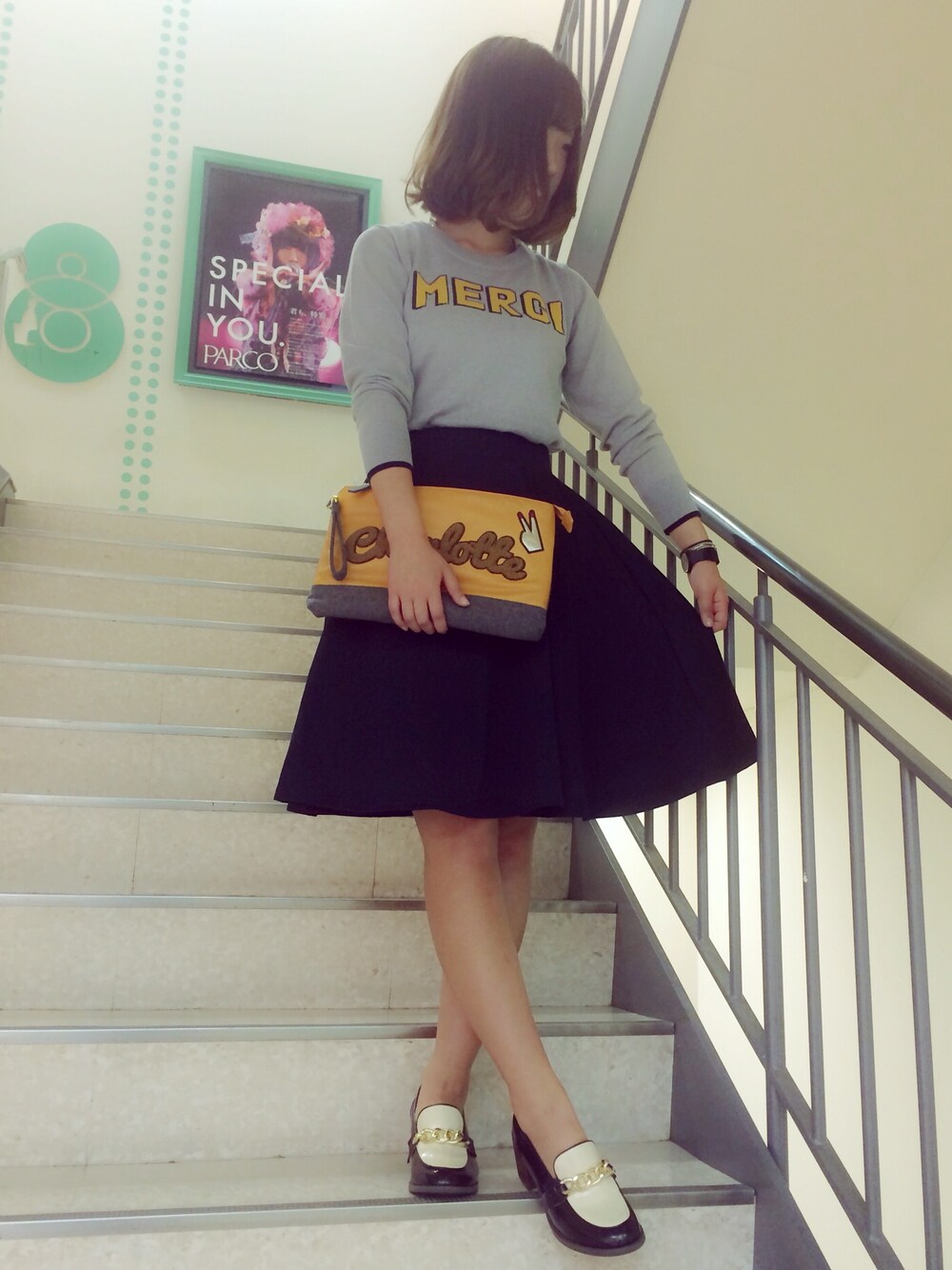 ショップブログ用写真 ɛ(⸅᷇᷅̑˾ͨ⸅᷆᷄̑ ⸌᷄̑˒ ेɜ 全身 PAGEBOY 今日入った新作ほやほや 💞 ものすごくすたいるよくうつってる🙀😂👍 スカート本当は深緑です!!(੭ुᐛ)੭ु⁾⁾ トップスの ロゴ メルシーて読むらしいんだけど (頭のいい後輩おしえてくれたww) あたしは メーシ?マーシ?と呼んでたとんだ 大馬鹿野郎です。大爆笑でした。恥ずかしい😂💥