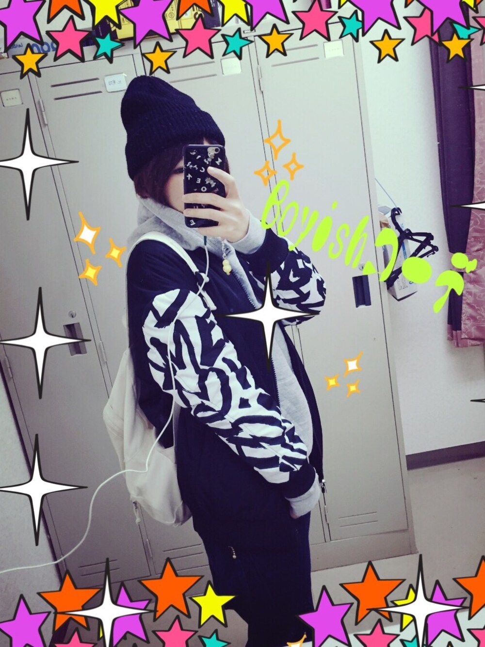 Boyishコーデ大好き♡ ロッカーを背景に…笑。 ニット帽→GU パーカー→GU(メンズ) ジャケット→Bershka デニム→RNA リュック→無印良品