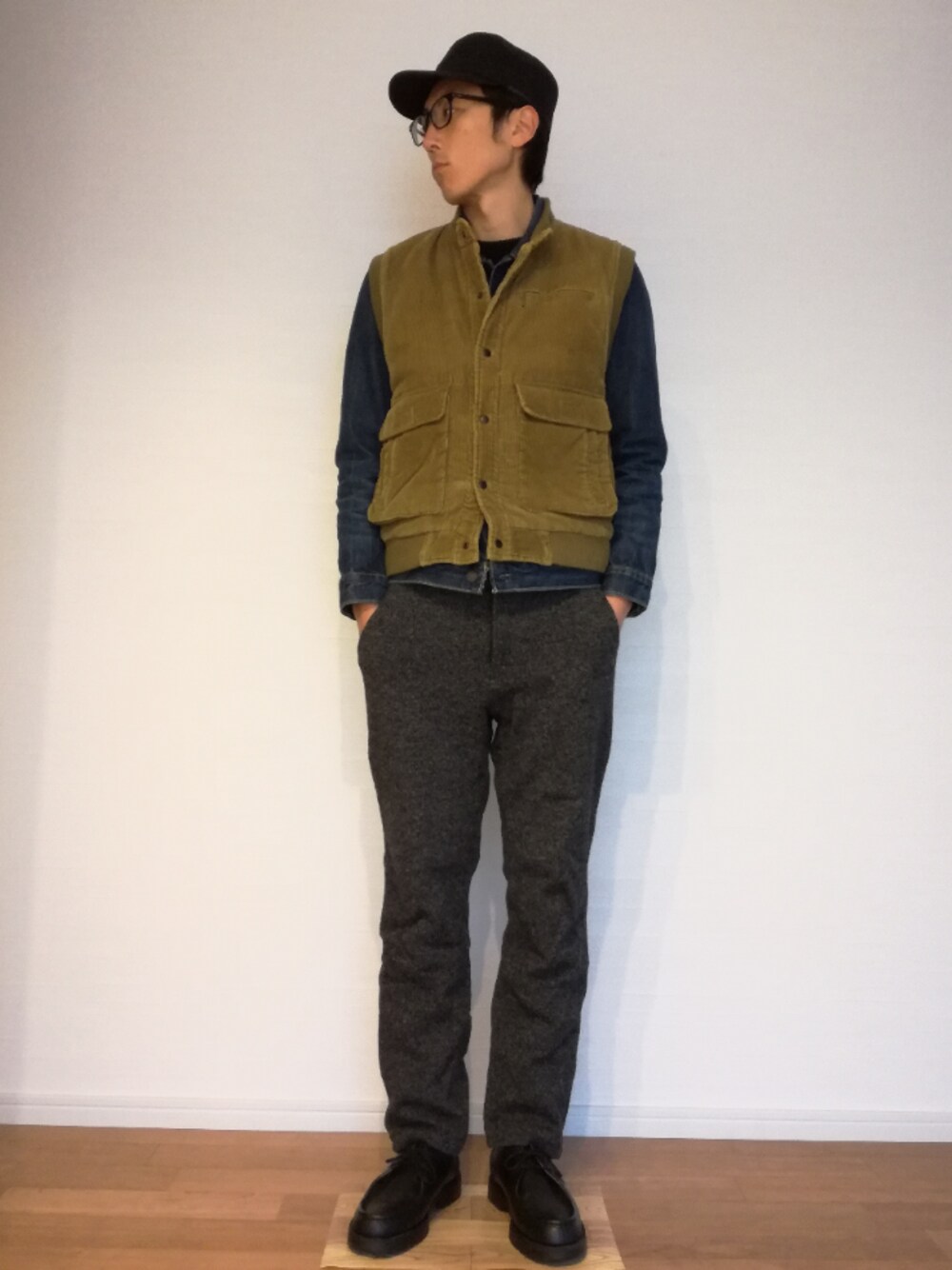 コーデュロイベストとウールパンツでアウトドアスタイルです。
