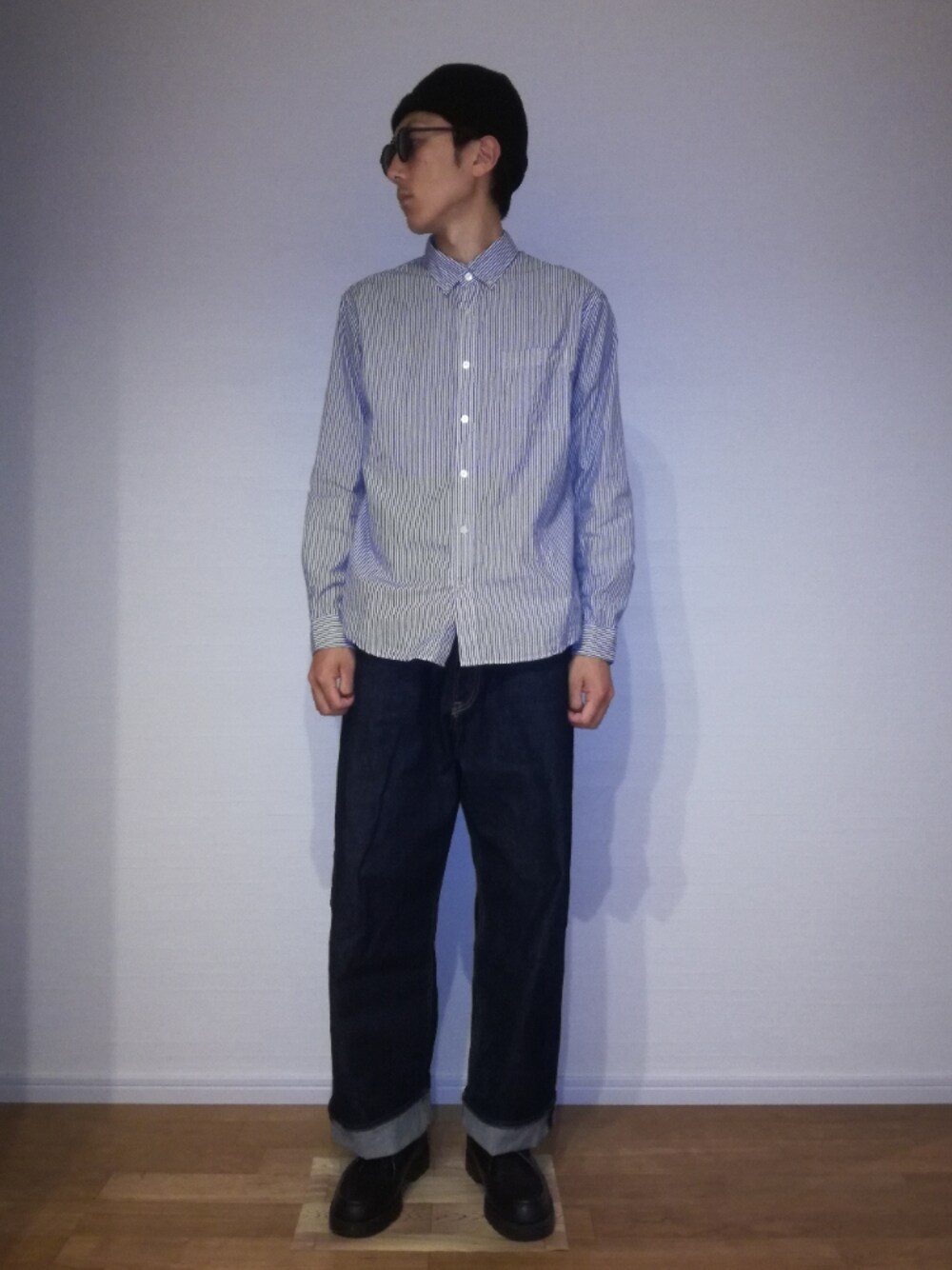 シンプルを黒のニット帽、サングラス、革靴で締める。