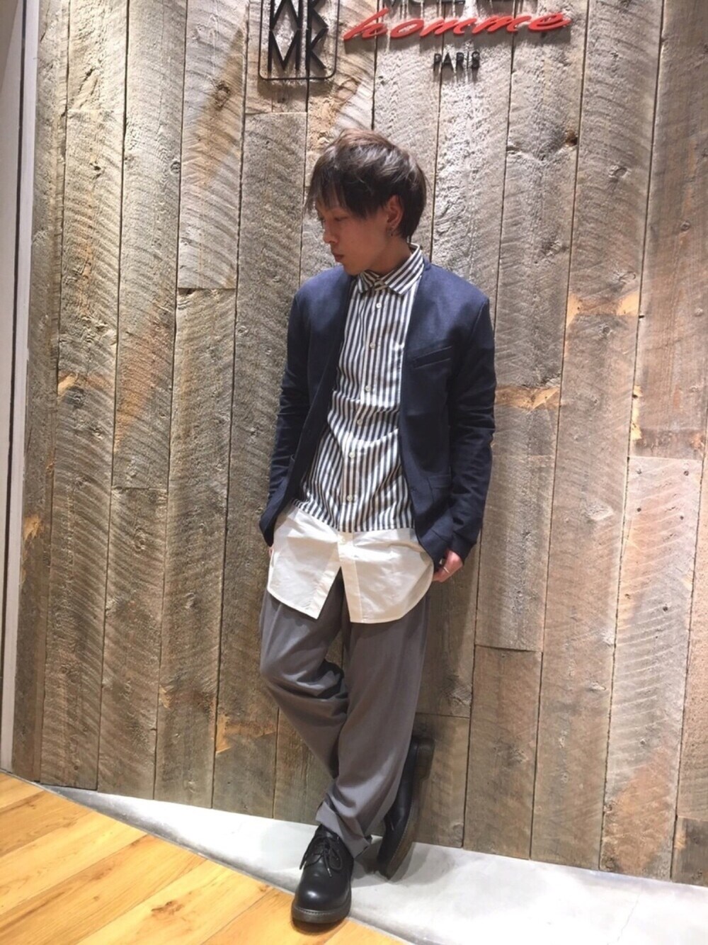 ゆるめキレイめスタイル! ノーカラージャケットと、インナーで使っているロング丈シャツとの相性が抜群‼️ これが新しいMKオムのスタイルっ✨👍🏻