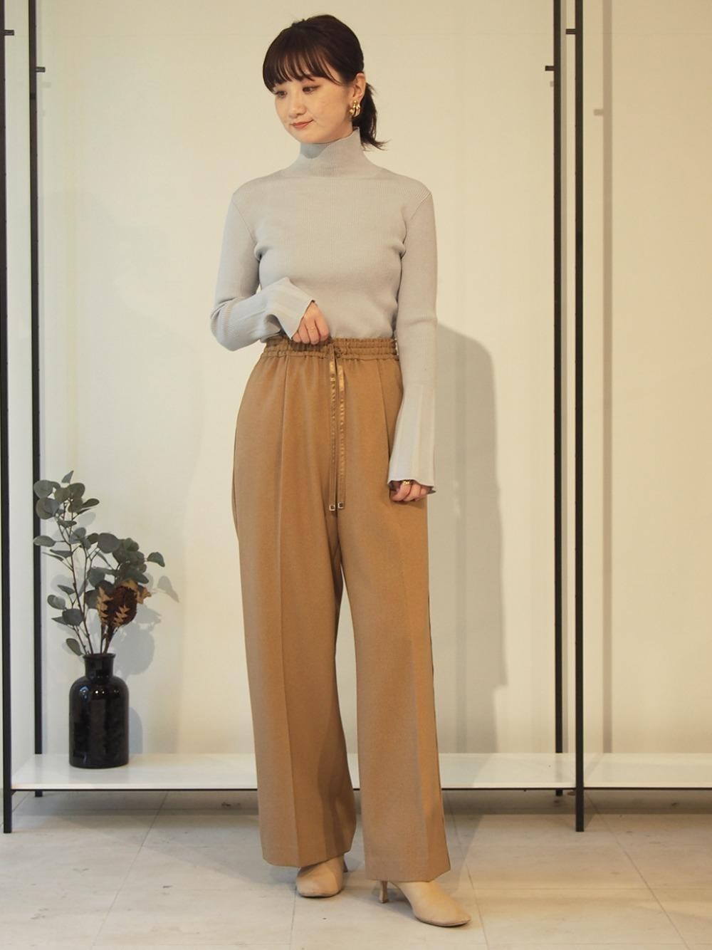 身長160㎝、ニット(size:FREE)、パンツ(size:FREE)、(シューズ スタッフ私物)。 タイトすぎず、ゆるすぎずの、絶妙なサイズ感が気に入っているリブニット。パンツやスカート合わせはもちろん、サロペットやジャンスカ等とのレイヤードにも使える便利な1着です。