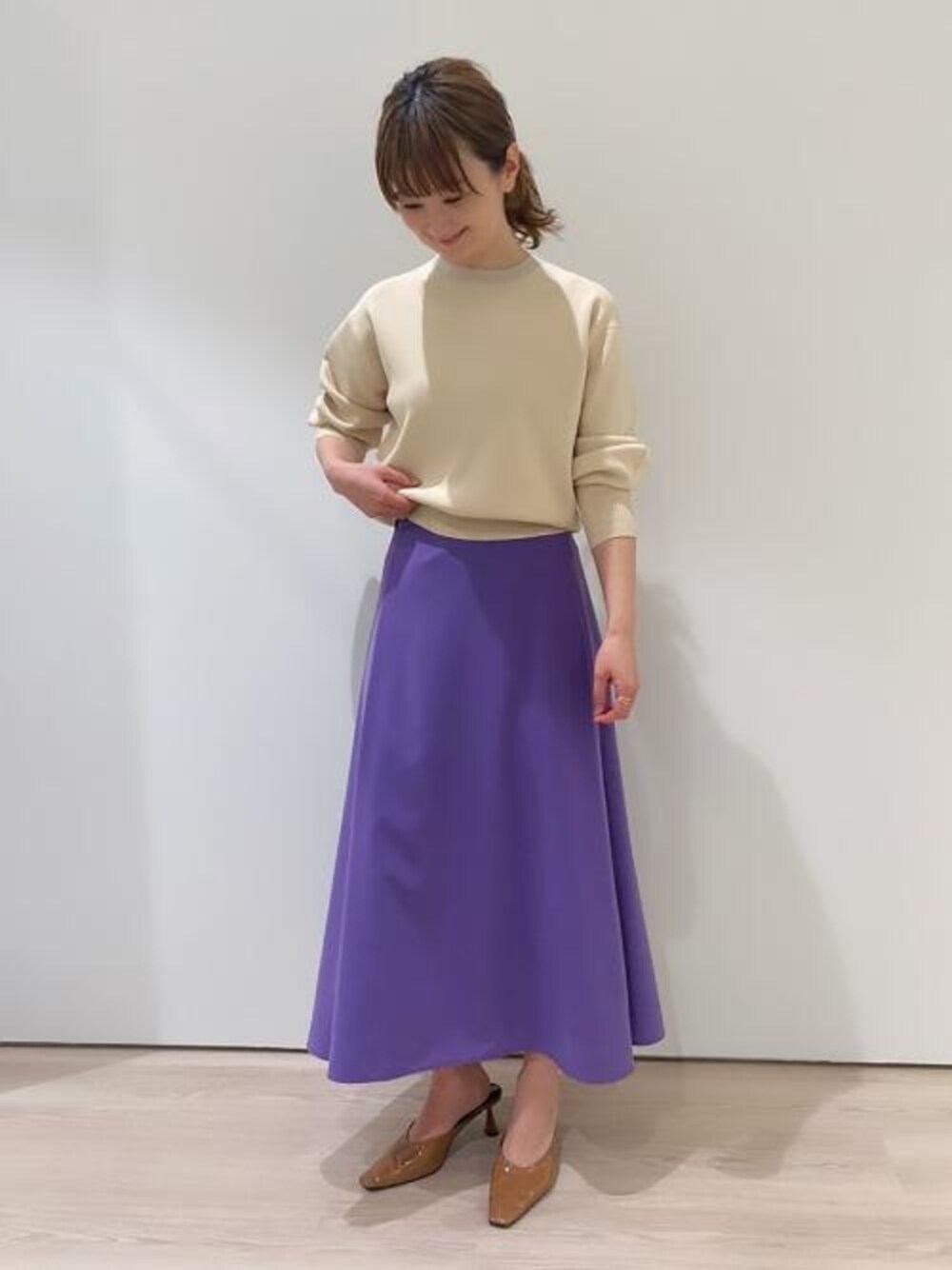 身長160㎝、トップス(size:FREE)、スカート(size:M)、(シューズ スタッフ私物)。 春らしいカラースカートスタイルです。